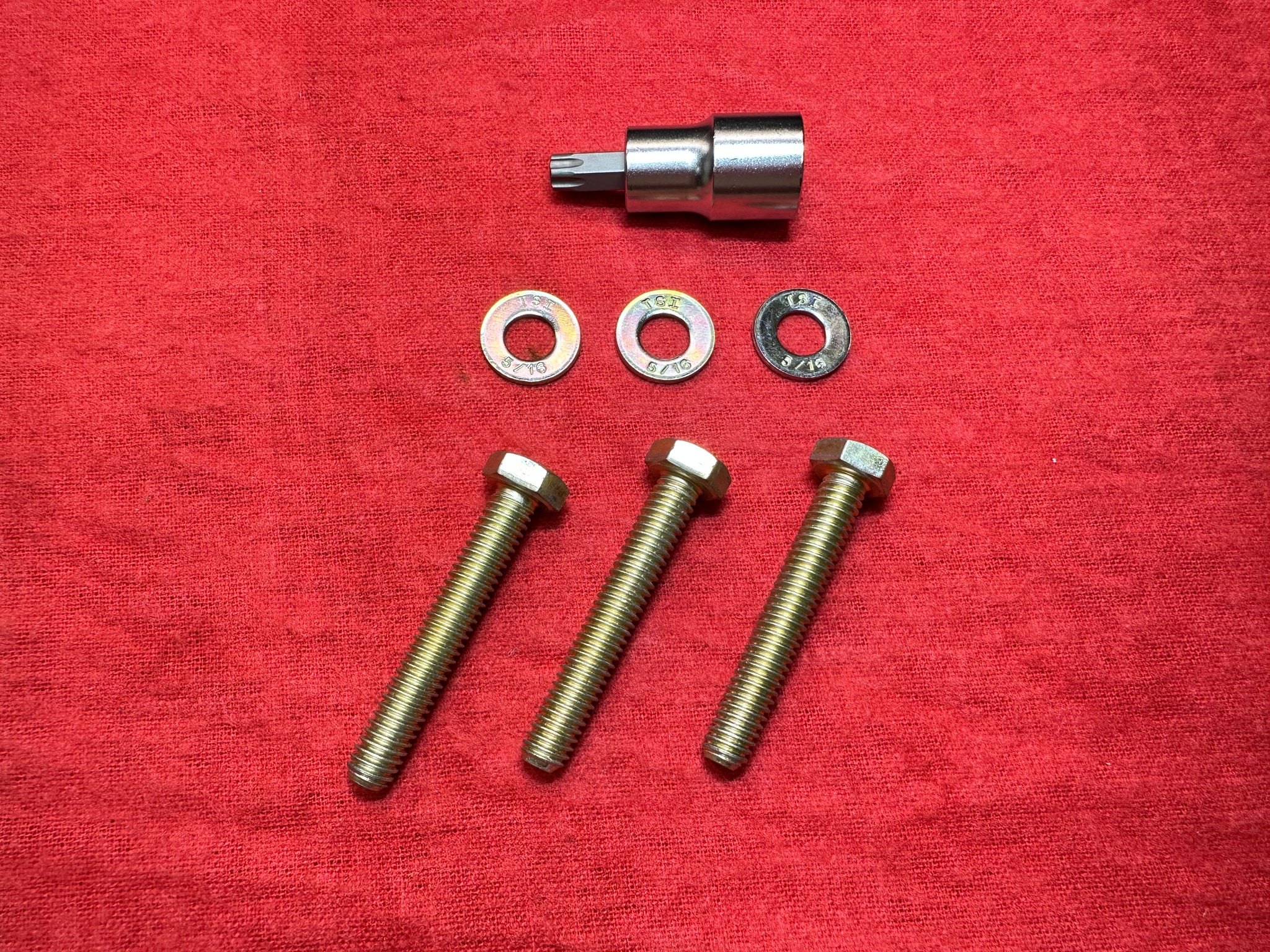 Most ATI Super Dampers require the removal of three Torx T40 Plus screws. Once removed you will need to use the puller/installer tool (ATI 918999 or Proform 66514) with three 5/16" bolts and washers. This kit includes one Torx T40 Plus socket and three grade 8, zinc yellow-chromate, 5/16" bolts and washers.
